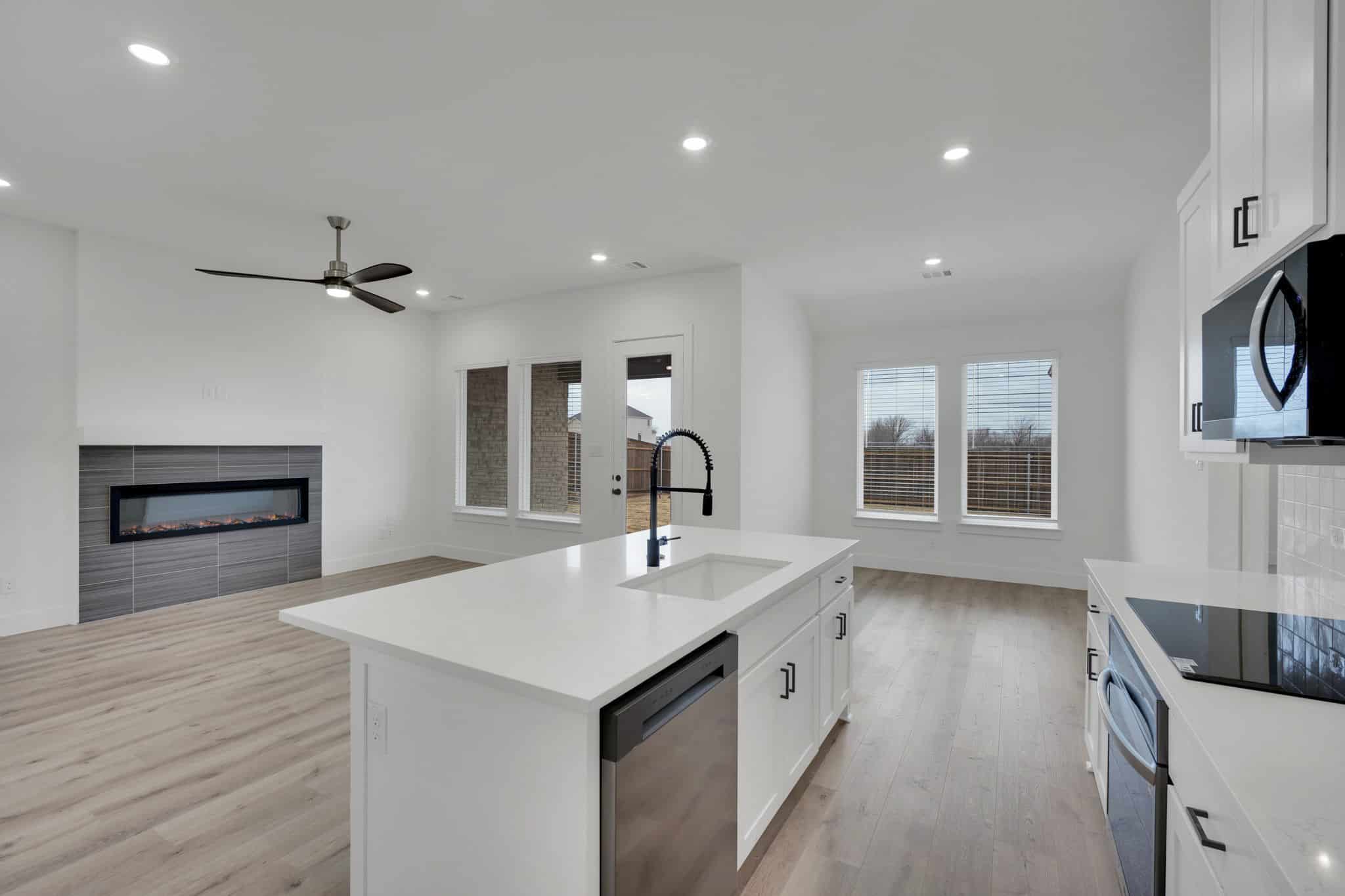 The Maya floor plan by Lillian Homes featuring 3 bedrooms, 2.5 bathrooms, a flex room, an open-concept family room with fireplace, and a covered patio.